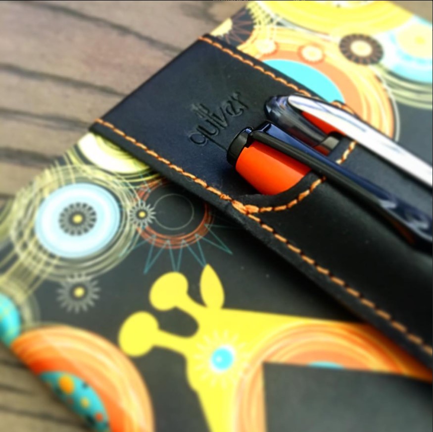 Los carcaj agarran las cubiertas de su cuaderno usando una banda elástica, lo que significa que no se necesitan imanes ni pegamentos adhesivos. Un Quiver puede durar cientos de cuadernos y muchos años de uso; simplemente deslícelo de un cuaderno al siguiente.